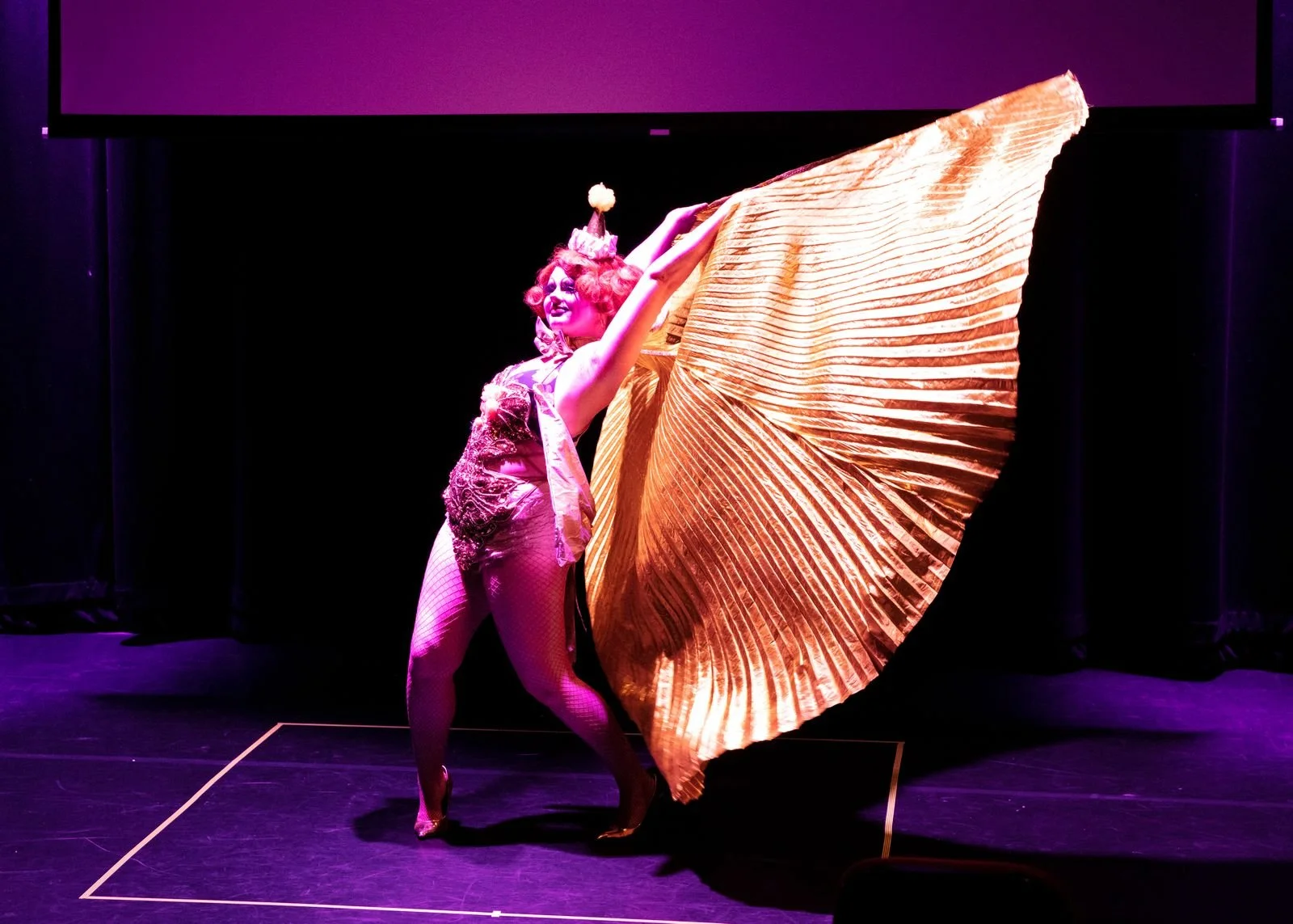A slim white burlesque performer raising two rainbow silk veil fans in the air triumphantly, she has short curly brown hair and is wearing gold underwear.