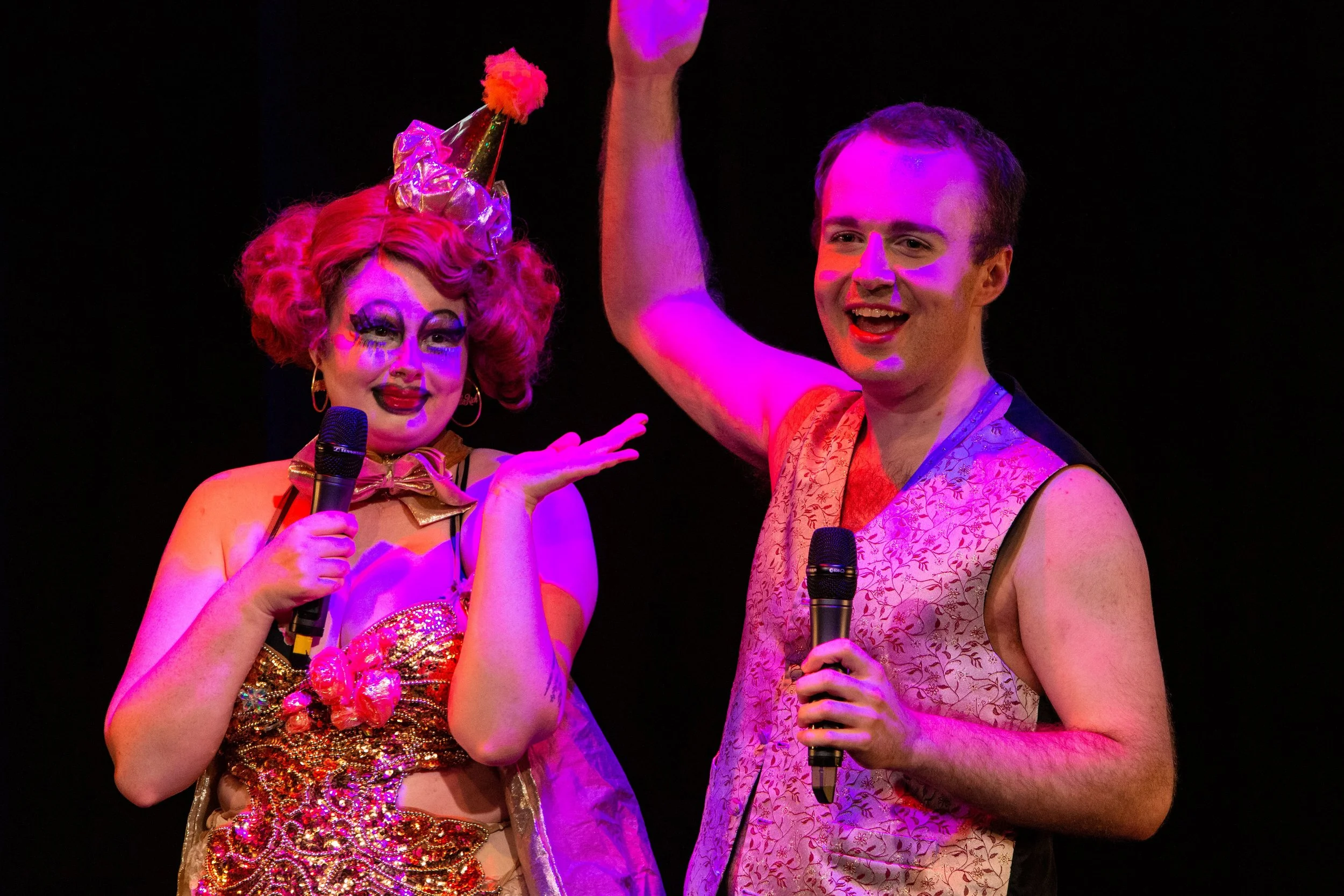 Ginger Tart and Frisky Whispers standing together, holding microphones & smiling while gesturing. They're both wearing sparkly clothes that show lots of skin.