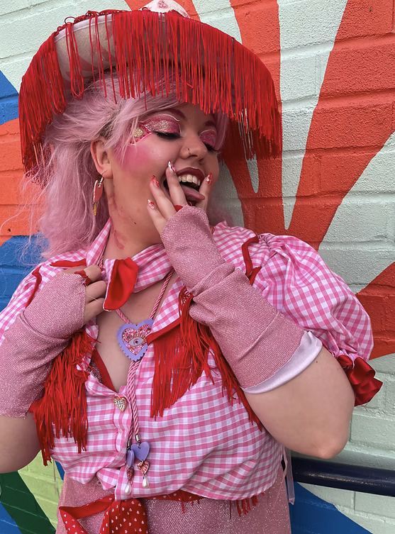 White drag queen with pink hair, wearing a cowboy hat with a red fringe and a checkered pink gingham crop top. Their make-up is bold and glittery pink with red. They're holding their fingers in a V-shape and sticking their tongue out between them.